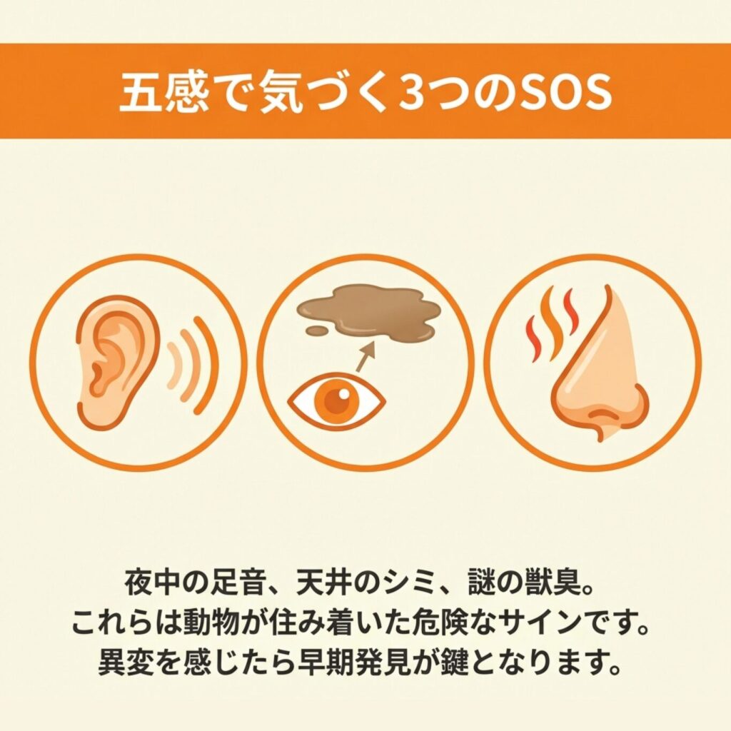 夜間の足音や天井のシミ、原因不明の獣臭を感じたら、早めに対策を講じることが大切です。
