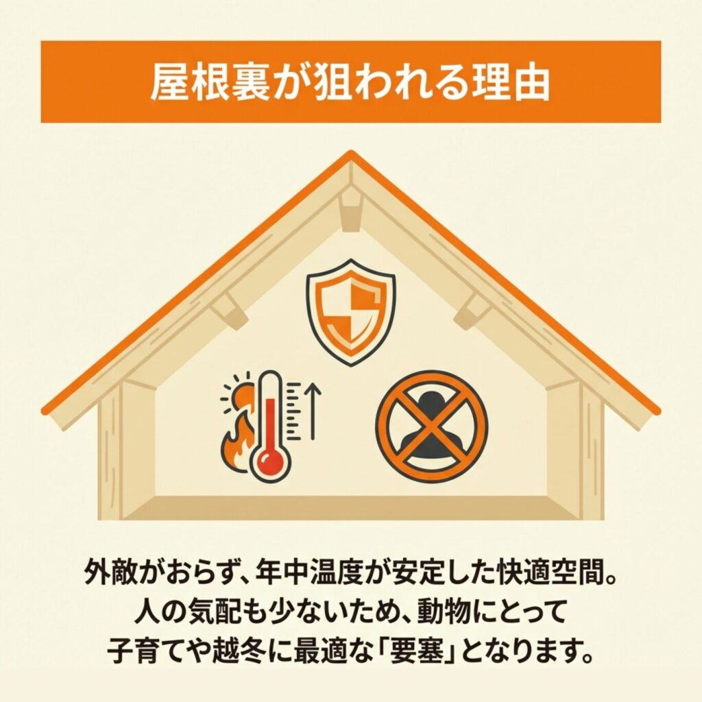 屋根裏は四方を壁や屋根材で囲まれた閉鎖空間であり、外敵から身を守るのに最適な場所です。