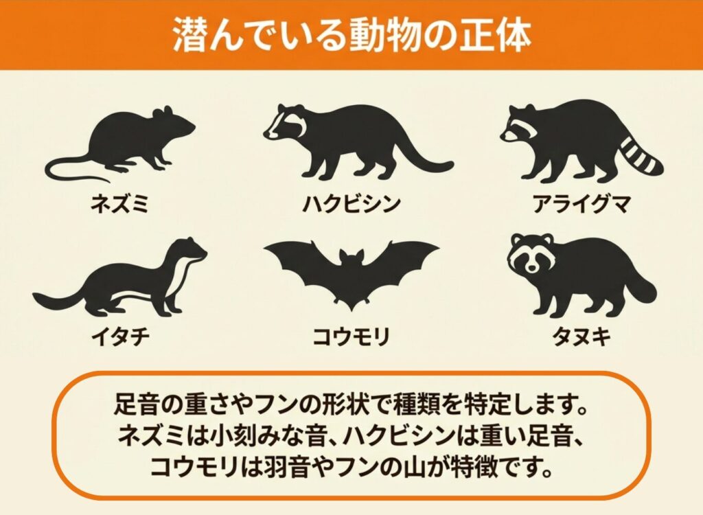 - 軽い足音(カサカサ、カリカリ)→ ネズミ、コウモリの可能性