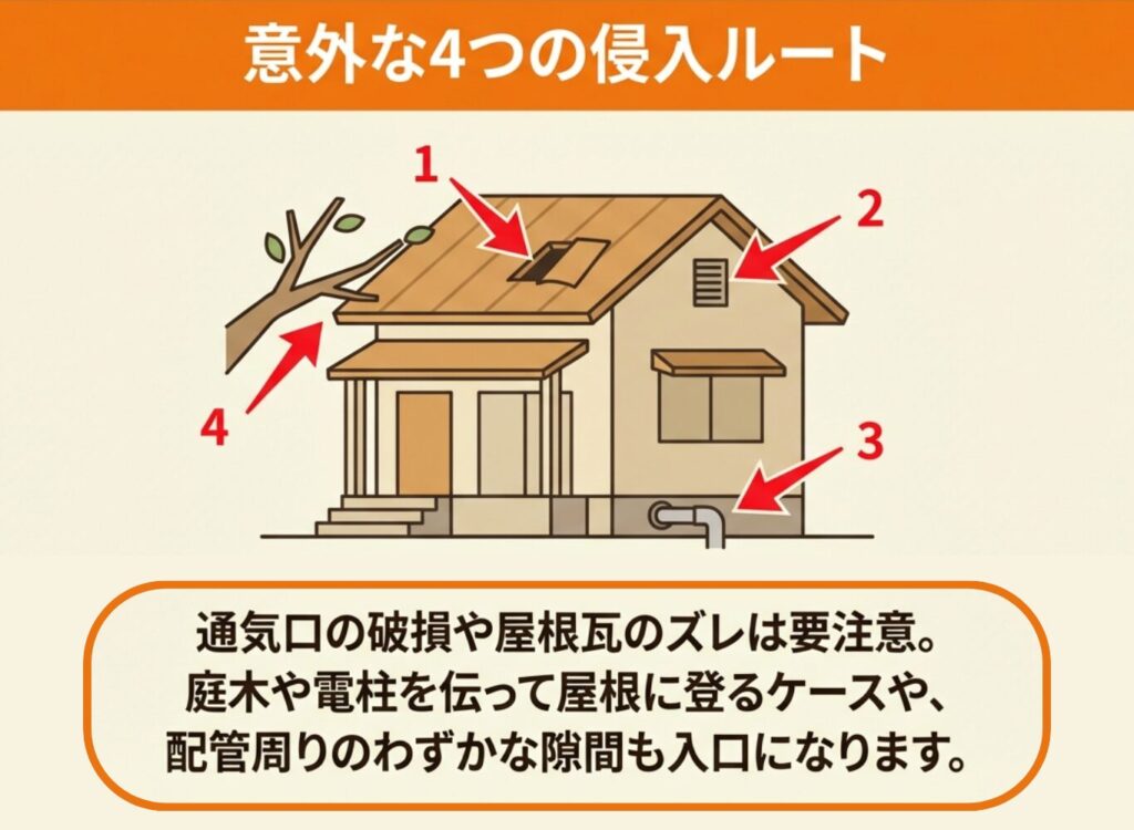こうした音が数日にわたって続くようであれば、単なる通りすがりではなく、屋根裏をねぐらとして利用している可能性が高まります。