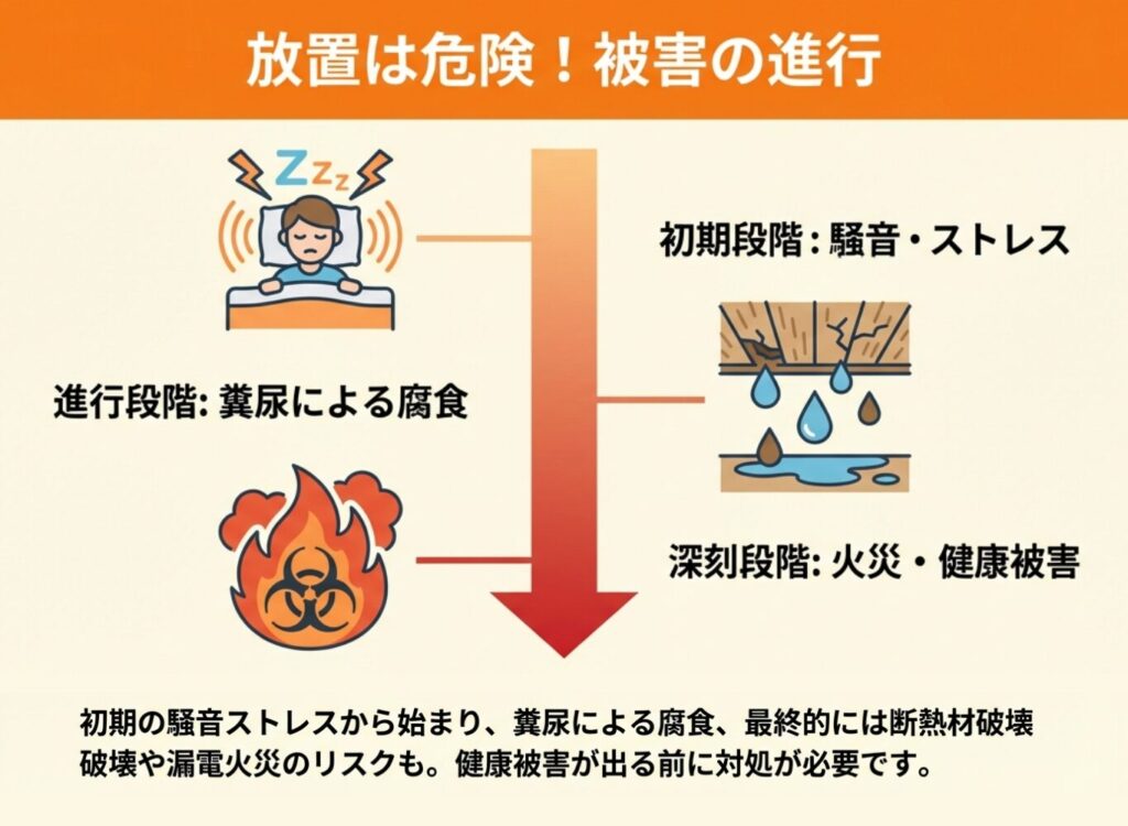 騒音・悪臭・感染症リスクを放置すると被害が拡大します。プロの調査で原因を特定しましょう。