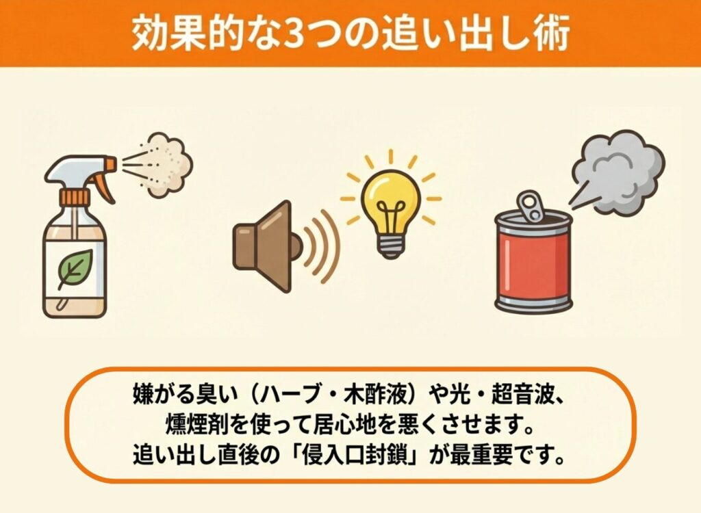 根本的な解決には「侵入口を見つける→動物を追い出す→侵入口を塞ぐ」という3つのステップが欠かせません。