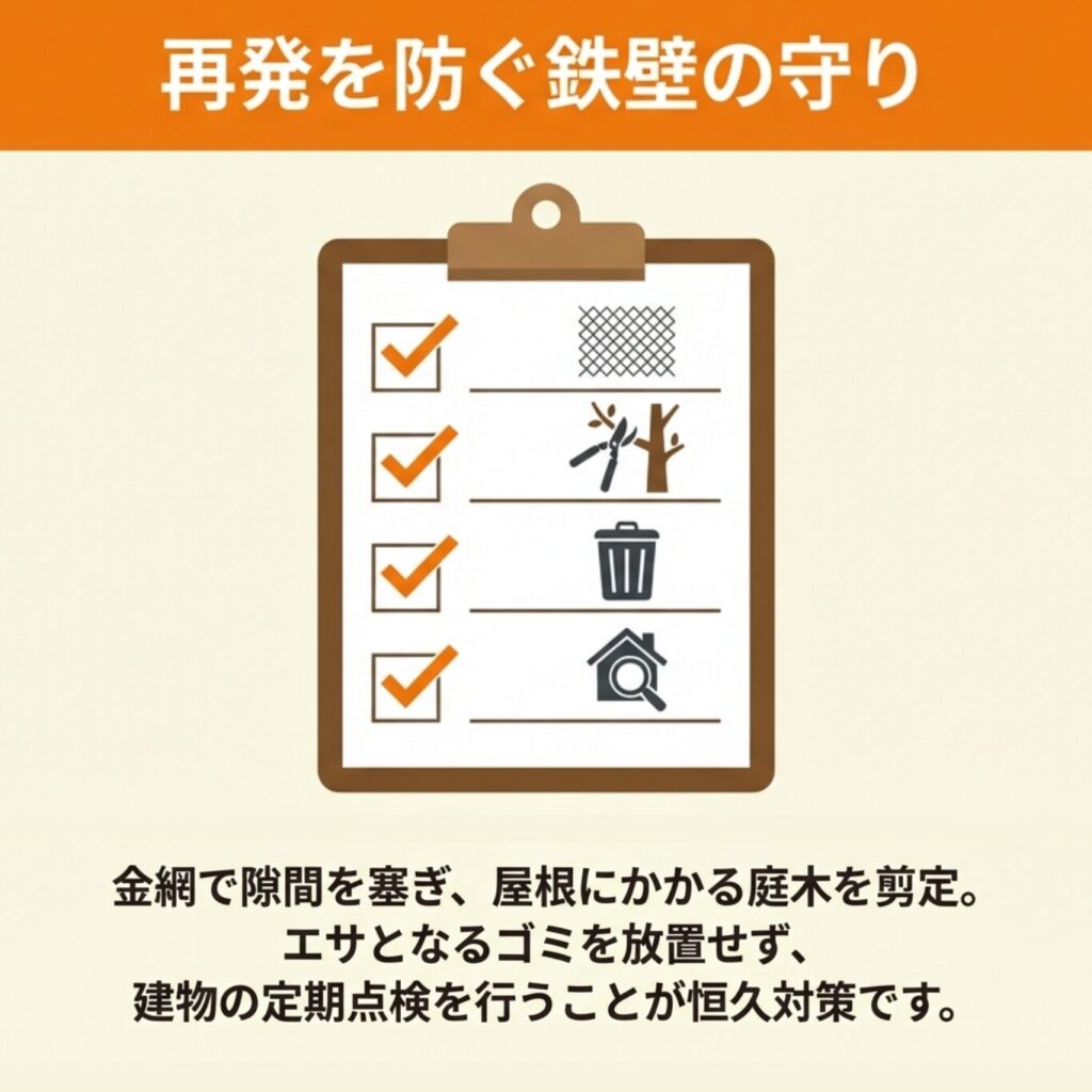 再侵入を防ぐためには、追い出しと同時に侵入口を完全に塞ぐことが不可欠です。