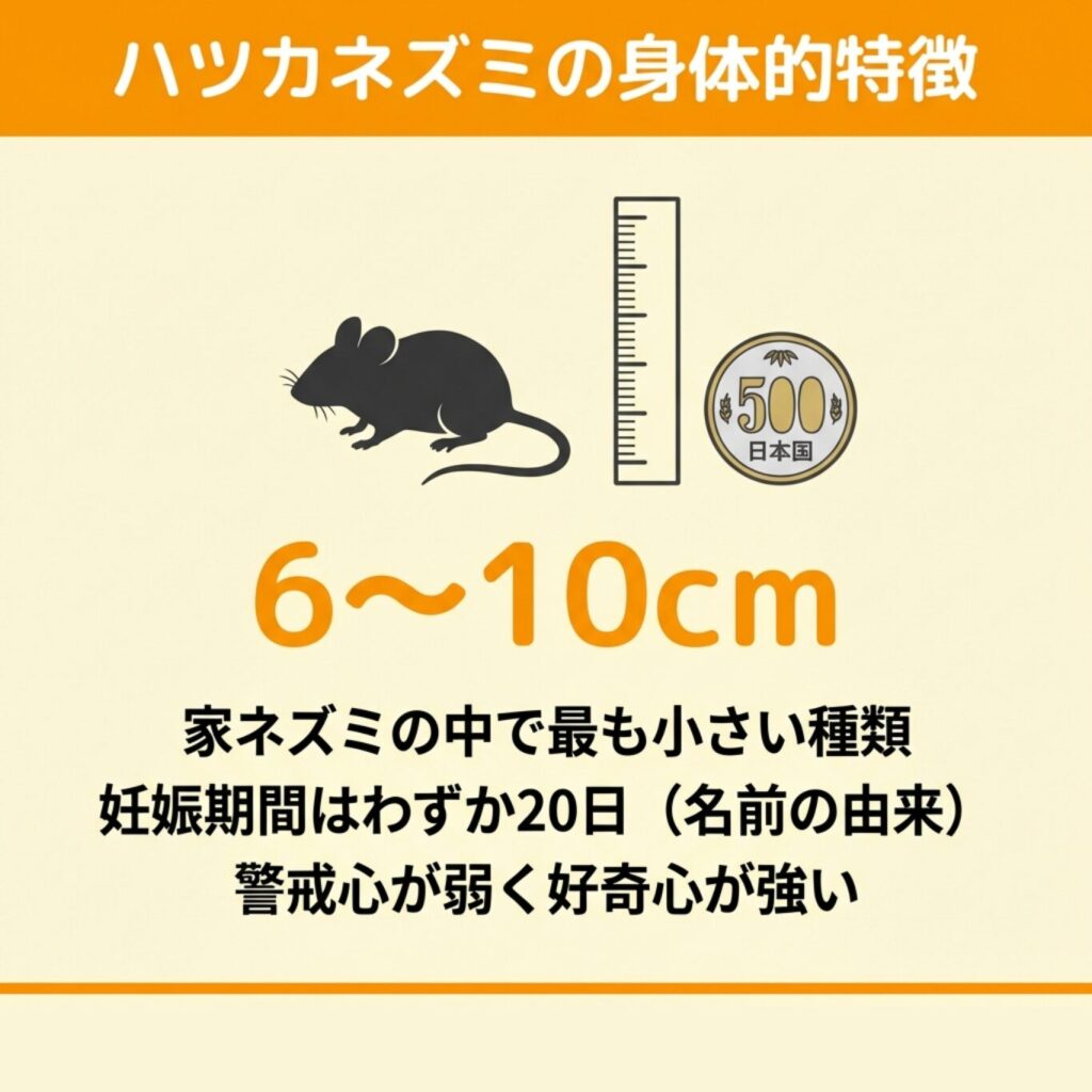 京都市の資料によると、ハツカネズミは体長6〜9cmで種子や穀類を好み、警戒心があまり強くないとされています(参考:京都市「ご家庭でできるネズミ対策について」)。