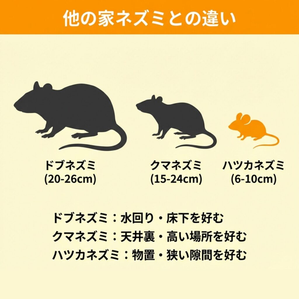 - ハツカネズミ:体長6〜10cm、狭い場所を好む、警戒心が弱い