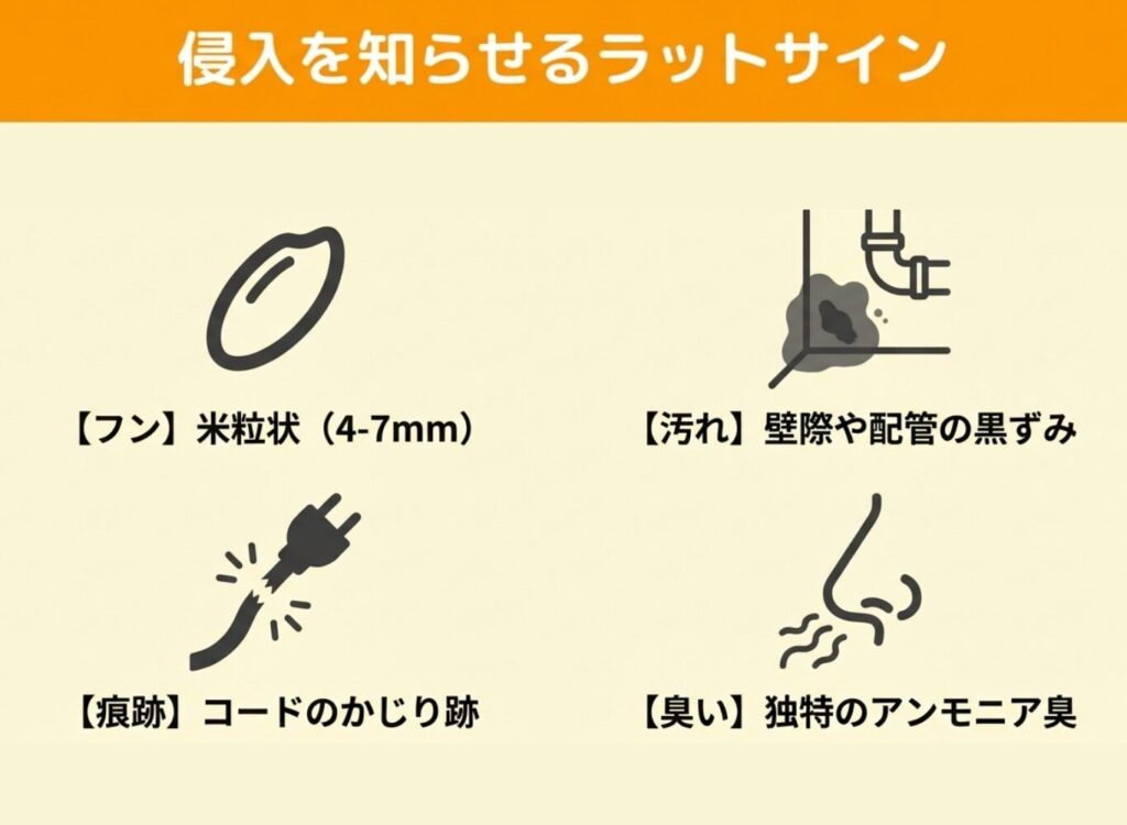 ネズミが通った痕跡のことを「ラットサイン」と呼び、フン・足跡・壁の汚れ・かじり跡などが該当します。