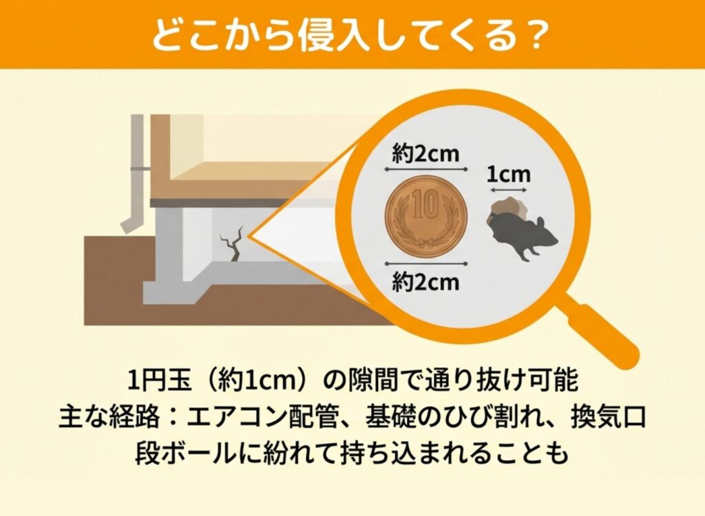 大阪市旭区の資料によると、ハツカネズミは「1cm(10円玉の半分の大きさ)の隙間があれば通ることができる」とされており、建物のあらゆる場所が侵入口になりえます(参考:大阪市旭区「ネズミ対策について」)。