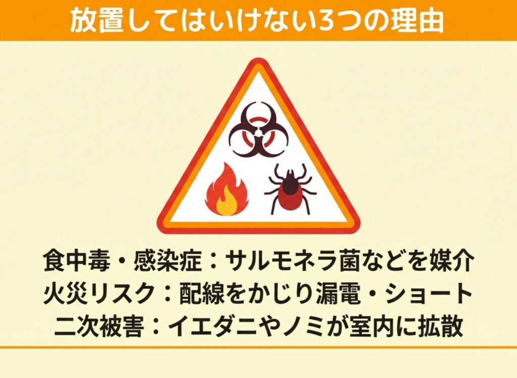 健康被害や火災リスクなど深刻な影響を及ぼす可能性もあるため、発見したら早めの対策が欠かせません。