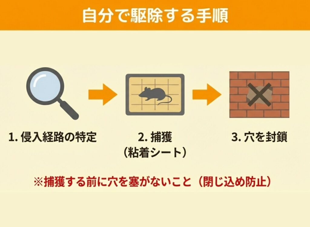 台東区の資料でも、トラップや殺そ剤の使用に加え、「侵入口や環境改善を併用しないと再発しやすい」と注意喚起されています(参考:台東区「ねずみの防除」)。