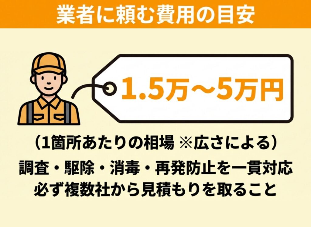 ハツカネズミの駆除を業者に依頼した場合、1箇所あたり1.5万〜5万円程度が相場とされています。