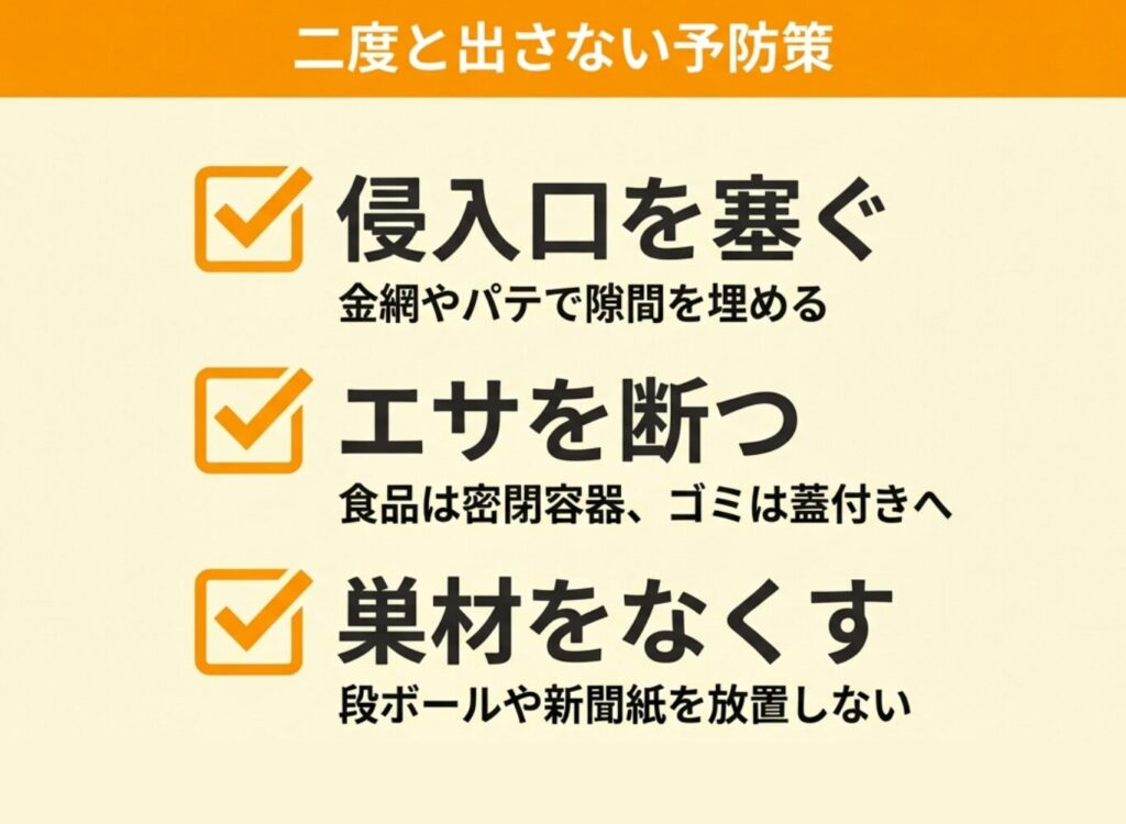 駆除が完了しても、予防対策を怠ると再び侵入される可能性があります。