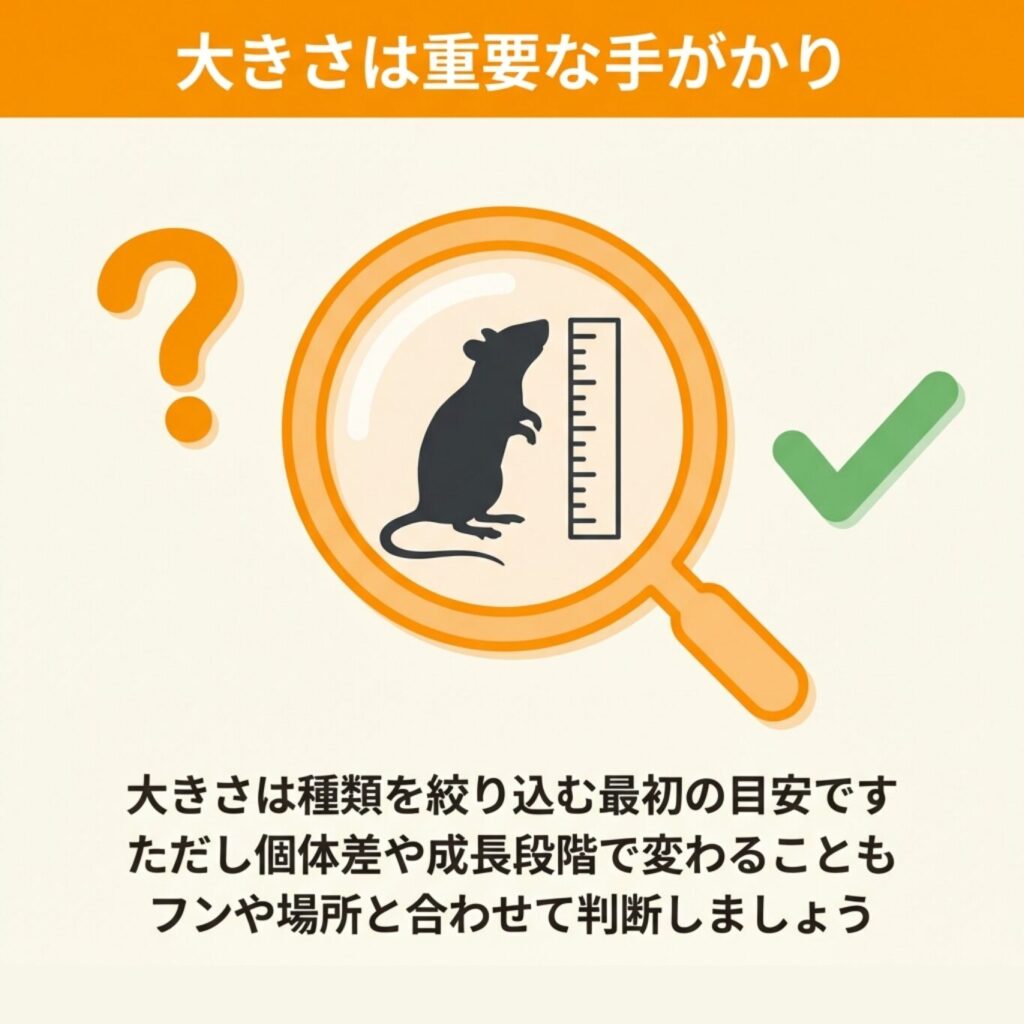 ネズミの体長や体重は種類を見分ける重要な手がかりですが、大きさだけでは判断を誤るケースもあるでしょう。