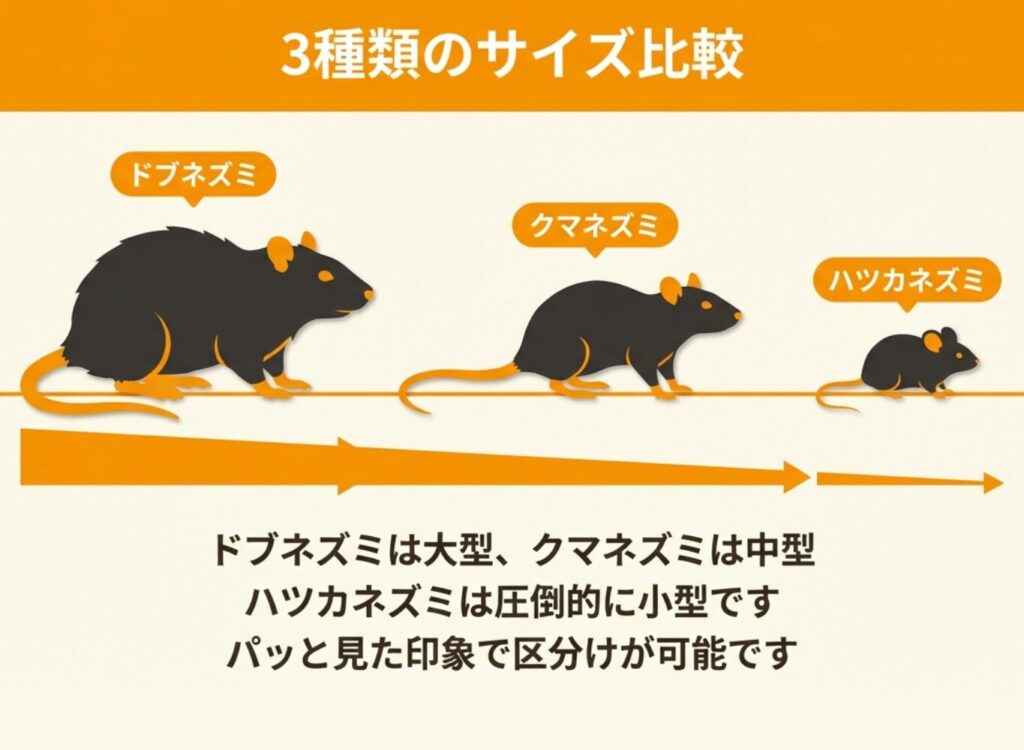 ドブネズミは体長20cm以上になる大型種で、クマネズミは15〜20cm程度の中型種、ハツカネズミは10cm以下の小型種となっています。