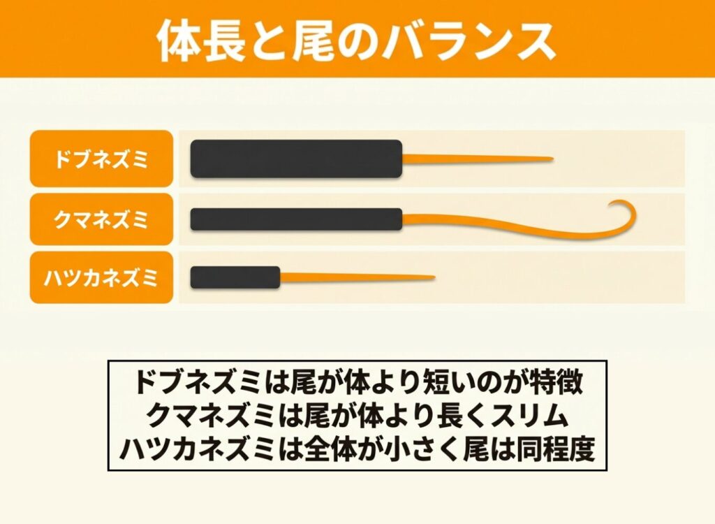 - 尾の長さの比率にも注目する