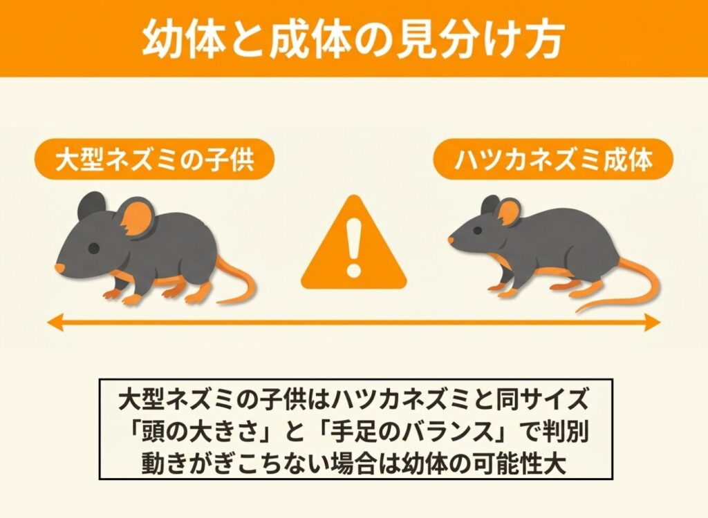 発見場所が穀物倉庫や農村地域ならハツカネズミ、都市部の天井裏なら幼体の可能性が高くなります。