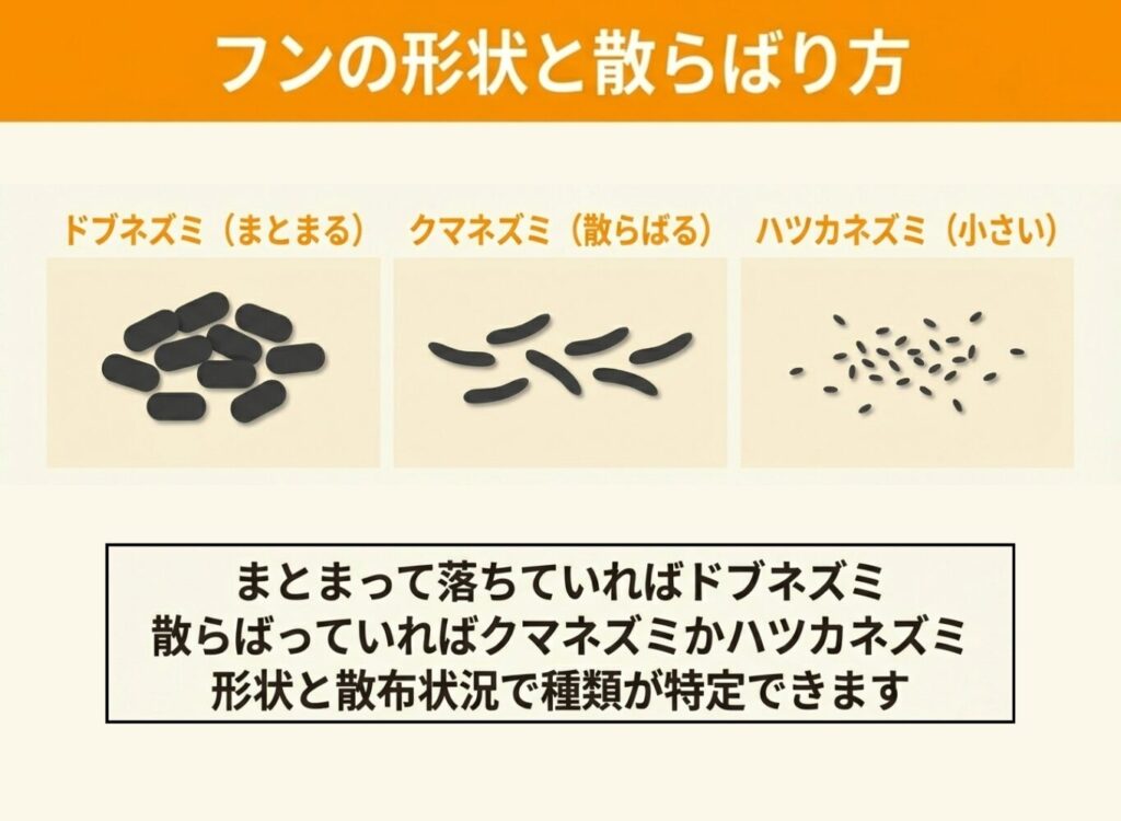 確実に見分けるには、フンの形状や生息場所など、複数の特徴を組み合わせて判断することが必要です。