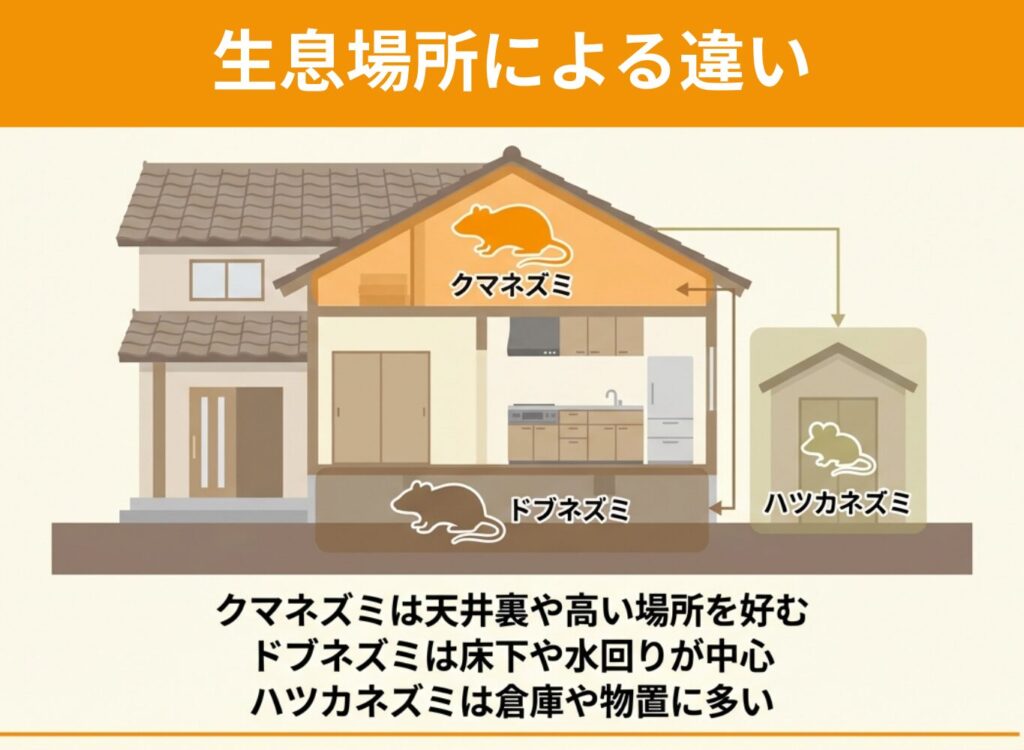 - 発見場所(天井裏・床下など)も判別材料になる