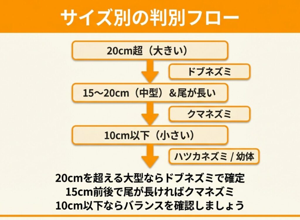 ネズミの種類を見分けるとき、体長などの大きさは最も分かりやすい判別材料ですが、それだけでは完全な特定は難しいでしょう。