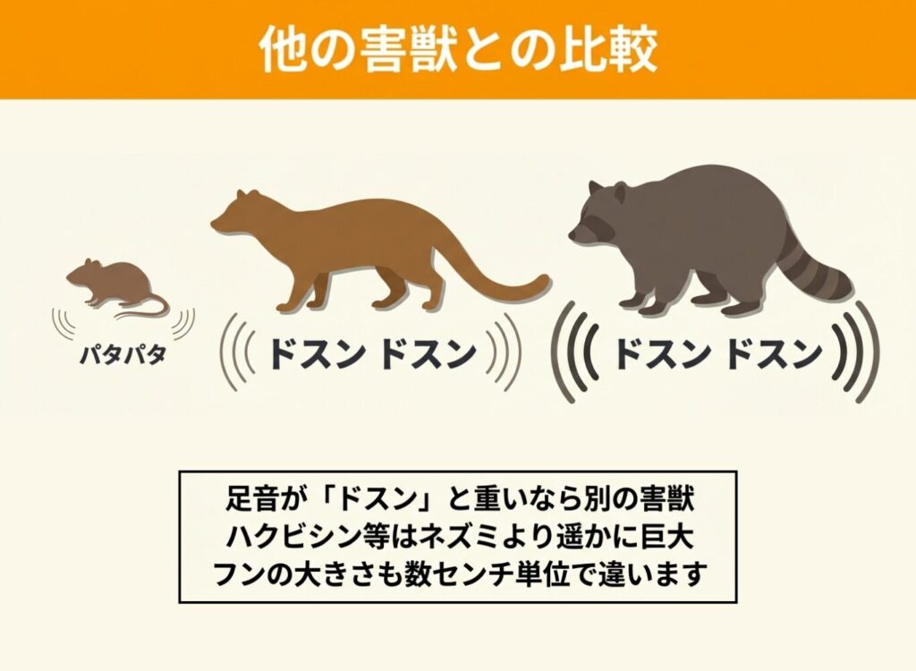 この重い体格のため、天井裏を移動するときに「ドタドタ」という重くはっきりした足音を立てることが多いでしょう。