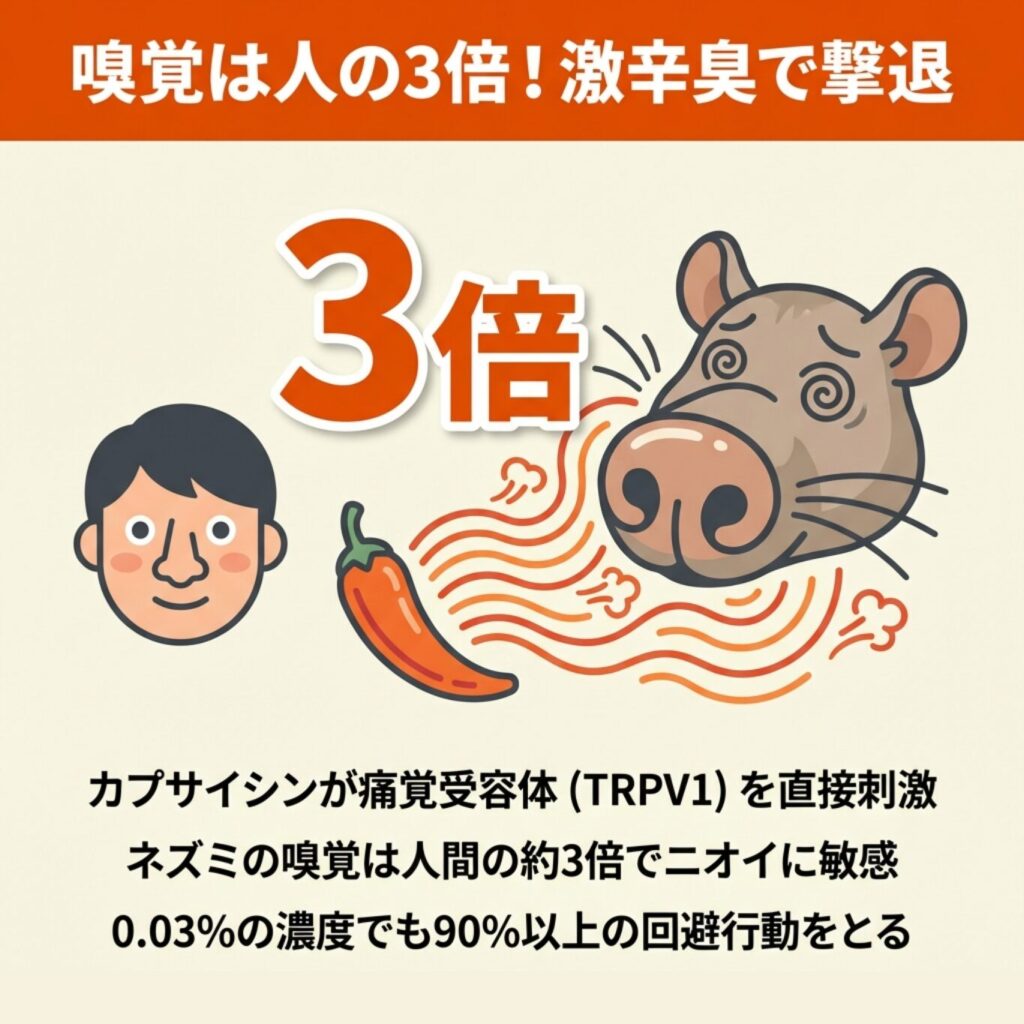 人間にとってはかすかに感じる程度のカプサイシンのニオイでも、ネズミにとっては耐えがたいほど強烈に感じられるわけです。