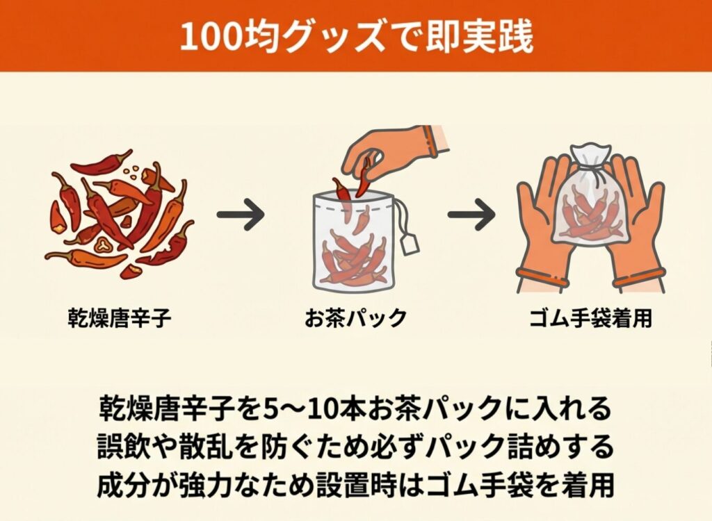 乾燥唐辛子をお茶パックに入れて設置するだけという手軽さに加え、死骸処理が不要で人体への影響も少ないため、応急処置としては非常に優れた方法といえます。