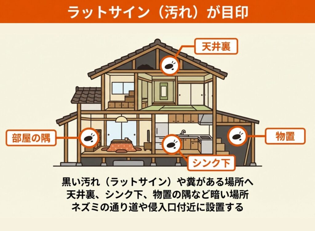 天井裏や床下、シンク下、倉庫や物置など、ネズミが好む暗くて静かな場所を重点的にチェックしましょう。