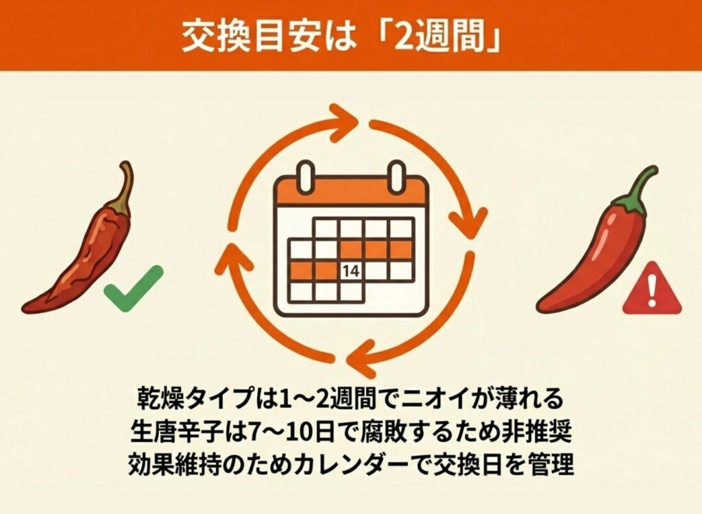 • 乾燥唐辛子:1〜2週間ごとに交換