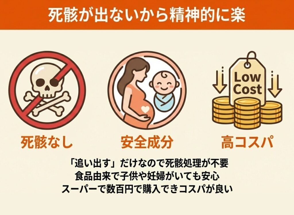 この点は、死骸の処理に抵抗がある方にとって大きなメリットといえるのではないかと思います。