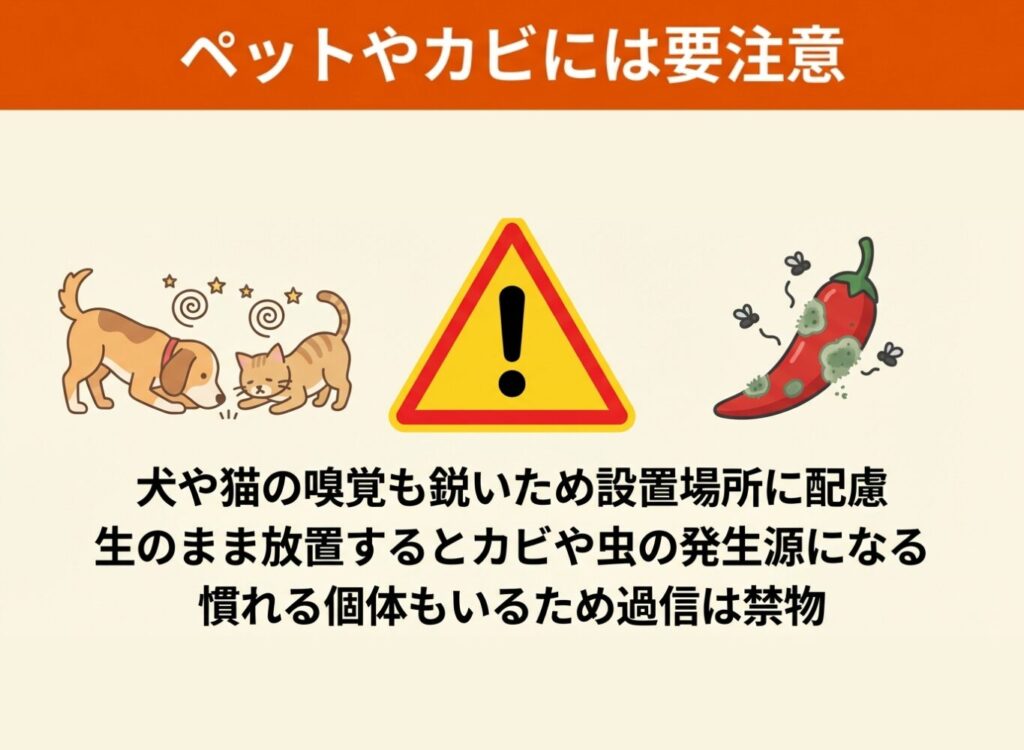 生の唐辛子を使う場合は賞味期限が7〜10日程度のため、それを過ぎると腐敗が始まり、逆に害虫を引き寄せる原因になりかねません。