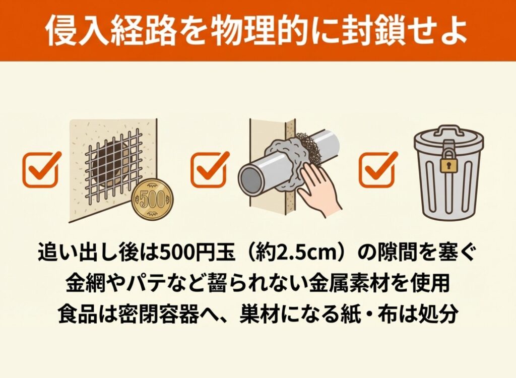 追い出した後は侵入口の封鎖やエサの管理を徹底し、再発を防止することが何よりも重要です。