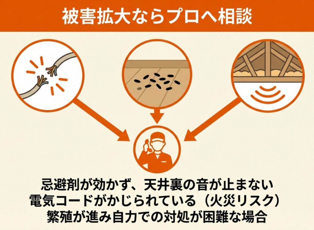食品や家財の被害が拡大している、電気コードがかじられている、異臭がするなどの症状があれば、早急な対応が必要です。