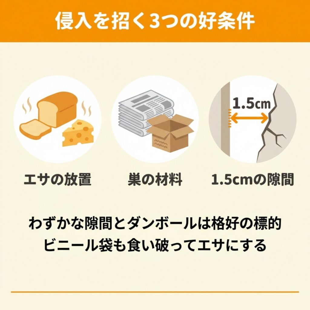 - エサ・巣材・隙間の有無がネズミを呼び込む要因