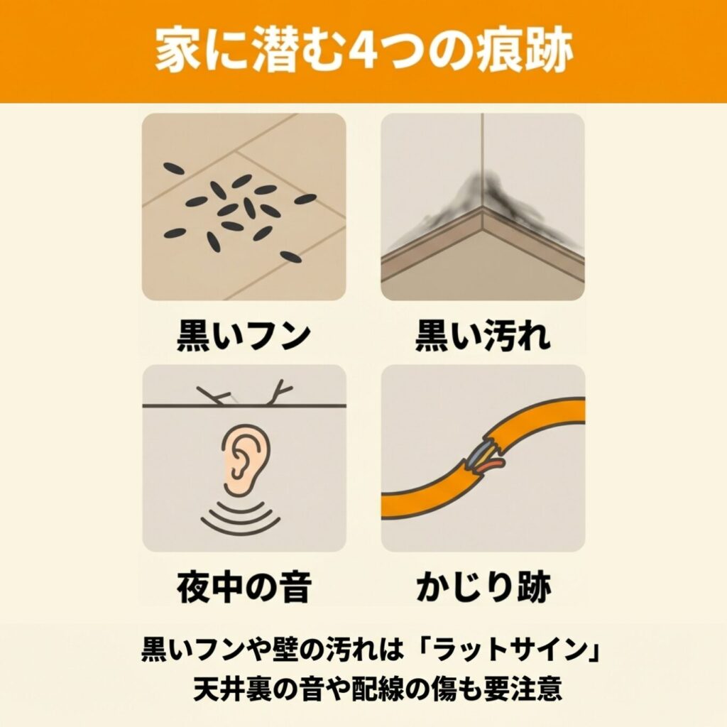 ラットサインは侵入口の特定にも役立つため、見つけたら場所をメモしておくと駆除時に有効です。
