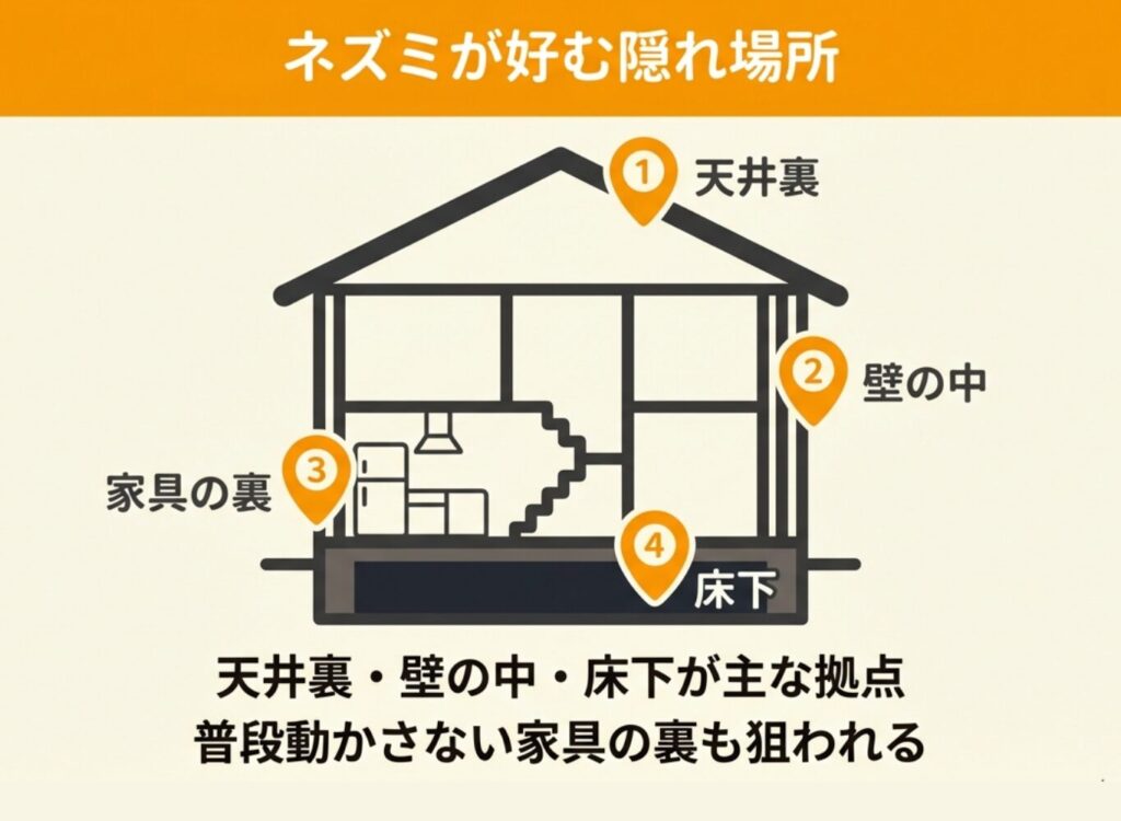 ネズミは暗くて狭い場所を好み、外敵から身を守れる安全な空間に巣を作ります。
