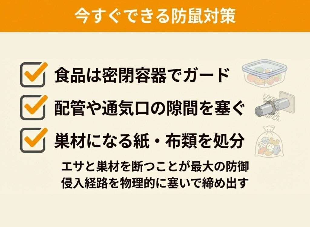 東京都福祉保健局の資料でも、ネズミ対策の基本として「エサとなる食品の管理」「侵入口の補修」「巣材になりやすい物の整理整頓」が挙げられており、ネズミが生活しにくい環境づくりが最も重要とされています。