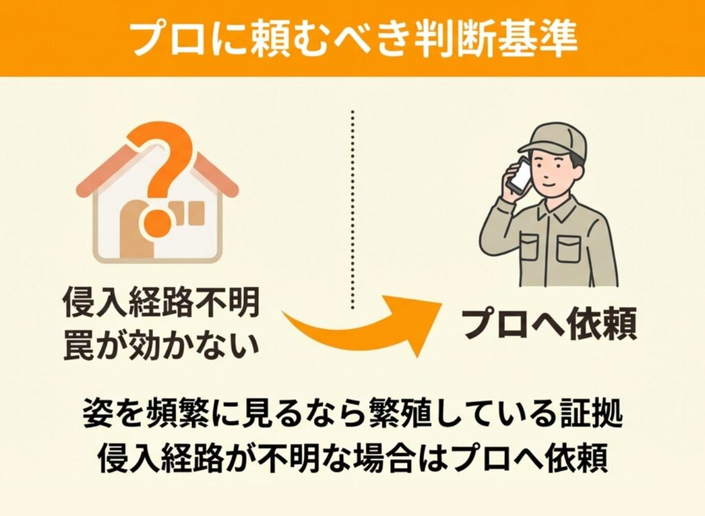 自分で対策を試しても被害が収まらない場合や、状況が深刻化している場合は、専門業者への依頼を検討すべきです。