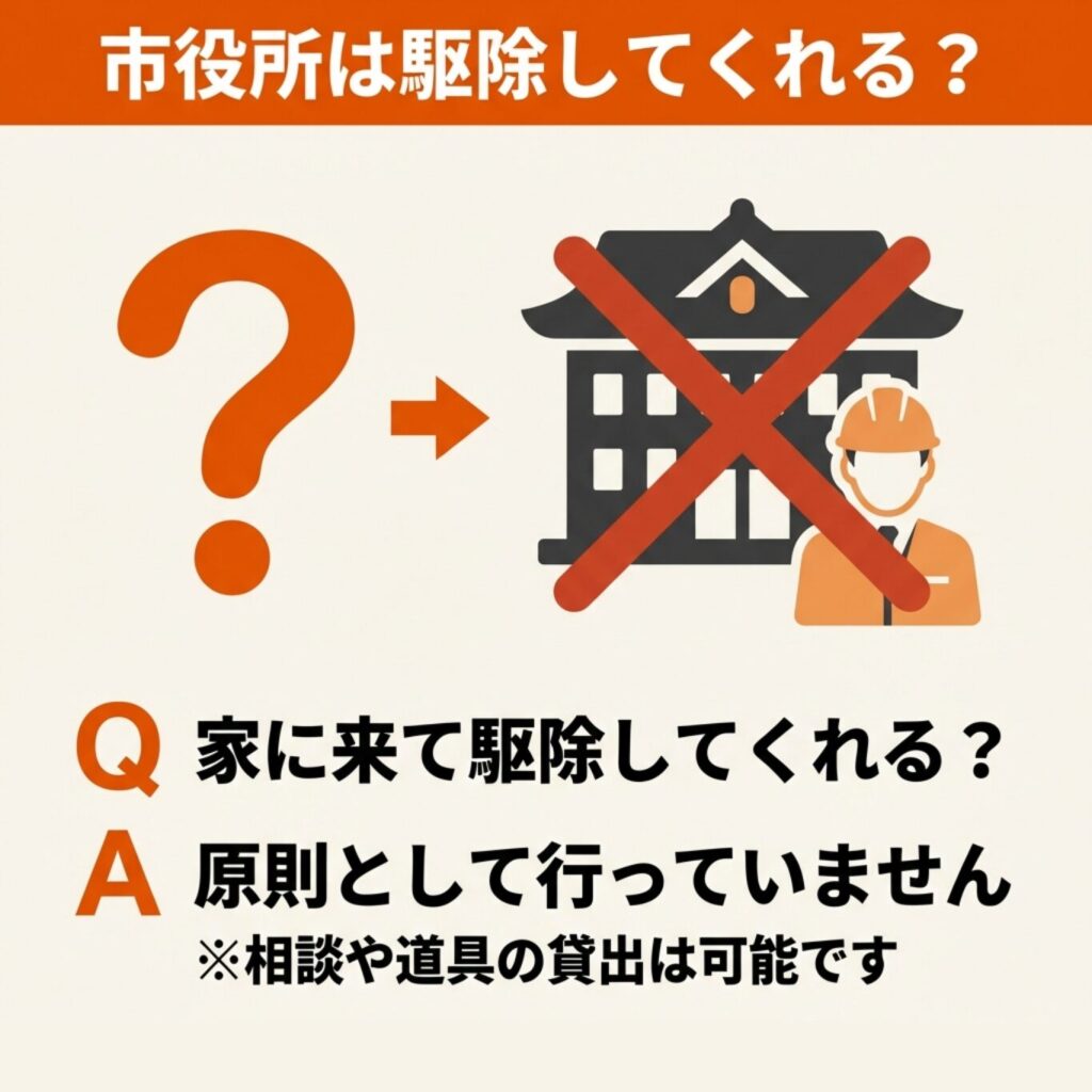 これは全国共通の対応方針であり、行政機関が直接駆除サービスを提供することはほぼないのです。