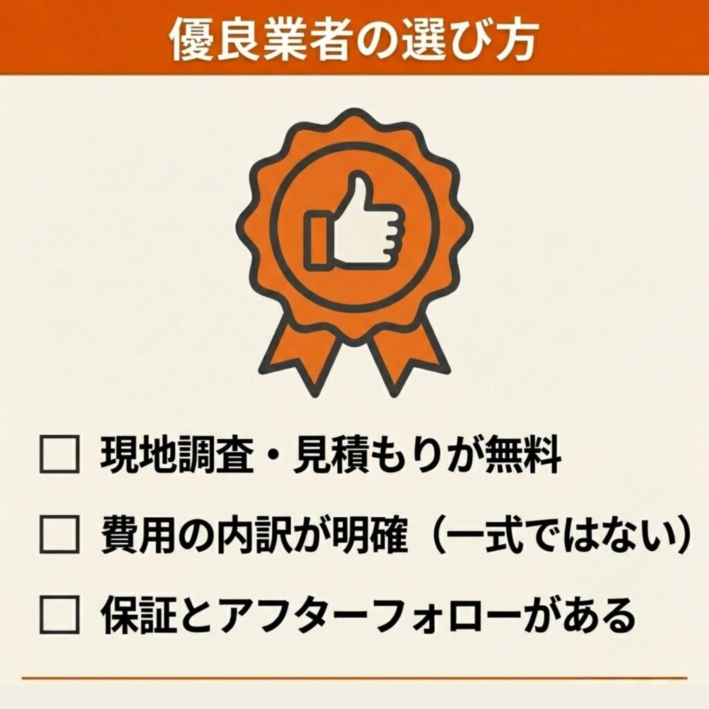 業者に依頼する際には、複数の業者から相見積もりを取り、作業内容や保証期間、口コミなどを総合的に判断して選ぶことが重要です。