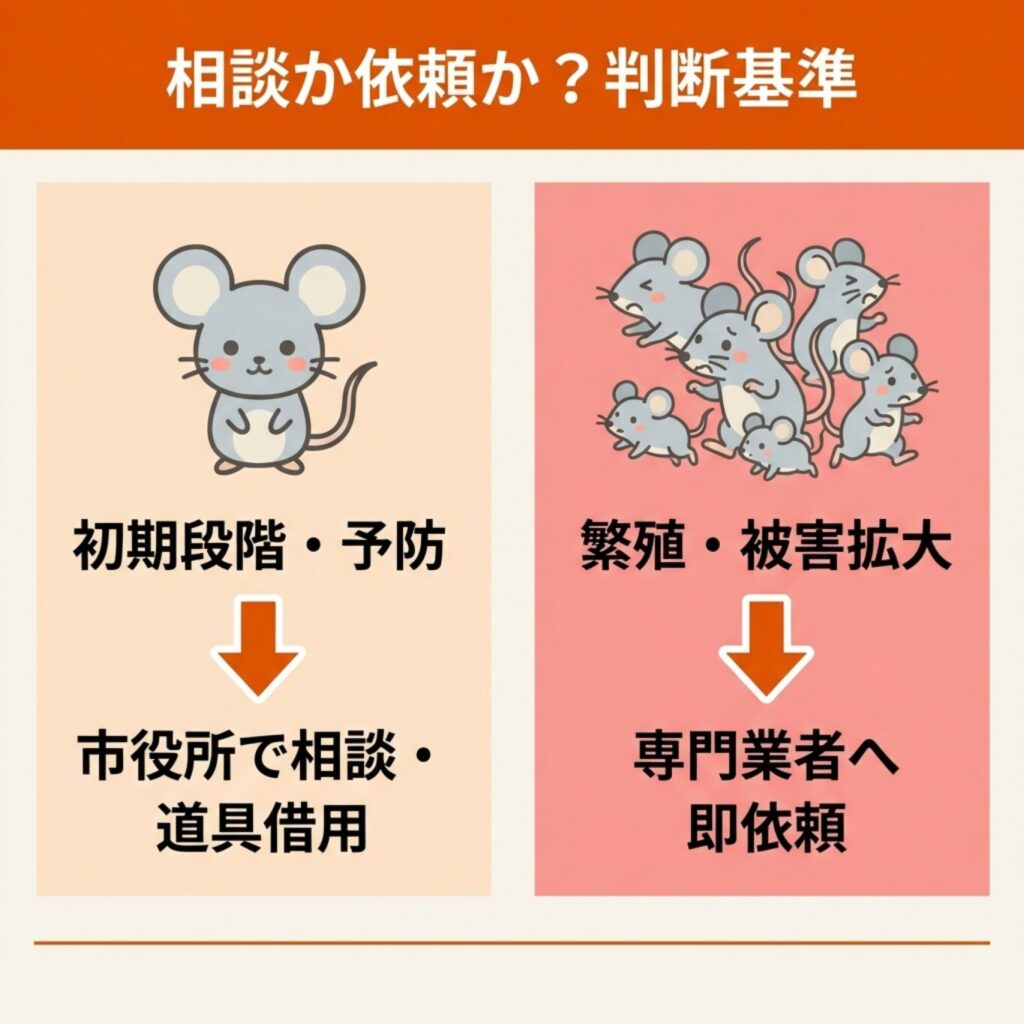 被害が軽度なら市役所のサポートを活用し、深刻なら早めに専門業者へ相談しましょう。