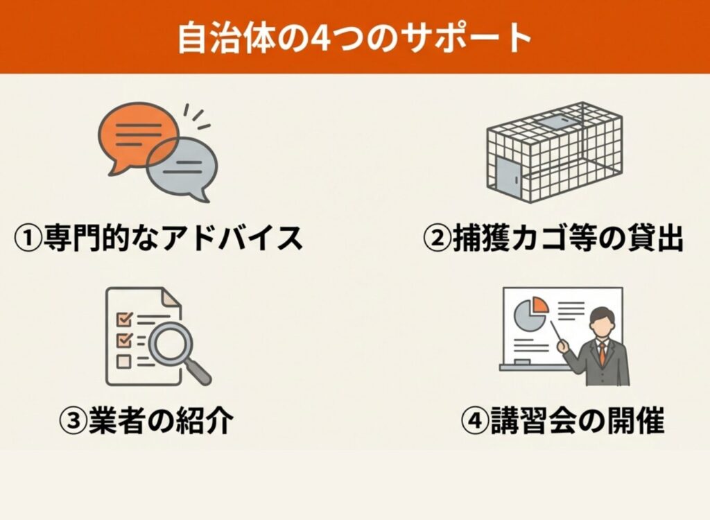 一方で、駆除道具の貸し出しや相談サービスなど、自治体ごとにさまざまなサポートを用意している場合もあります。