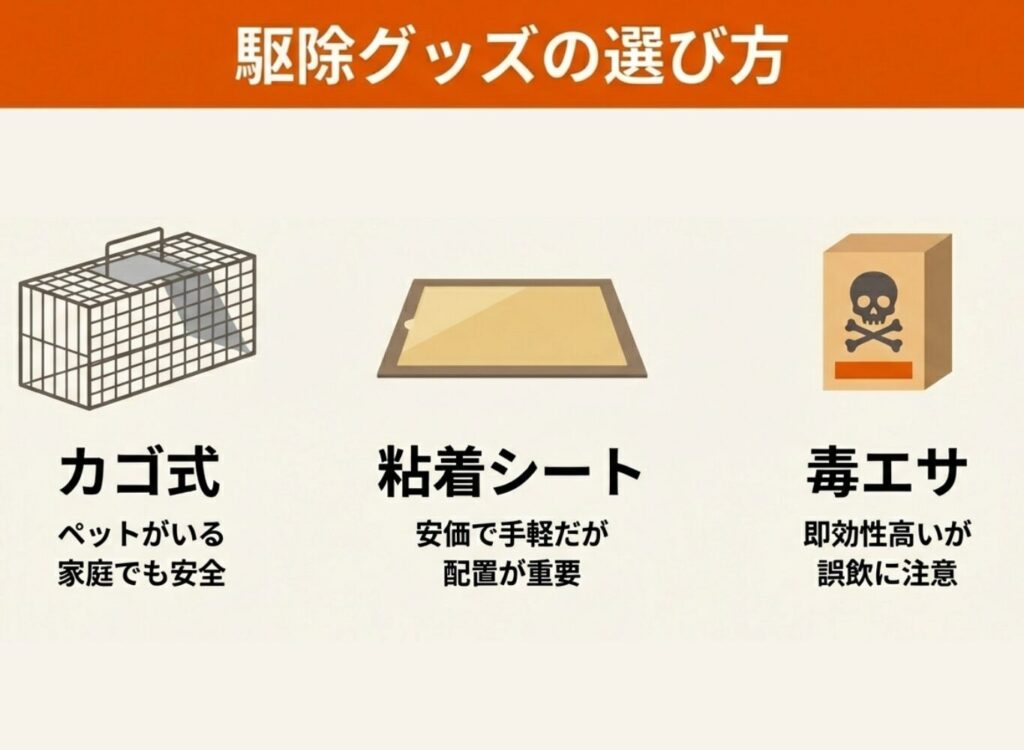 毒エサはネズミを直接駆除できる即効性の高い方法ですが、小さなお子さんやペットがいる家庭では誤飲に注意が必要です。