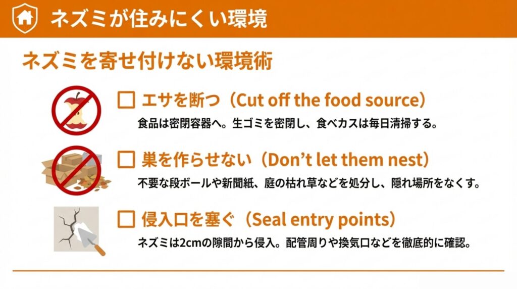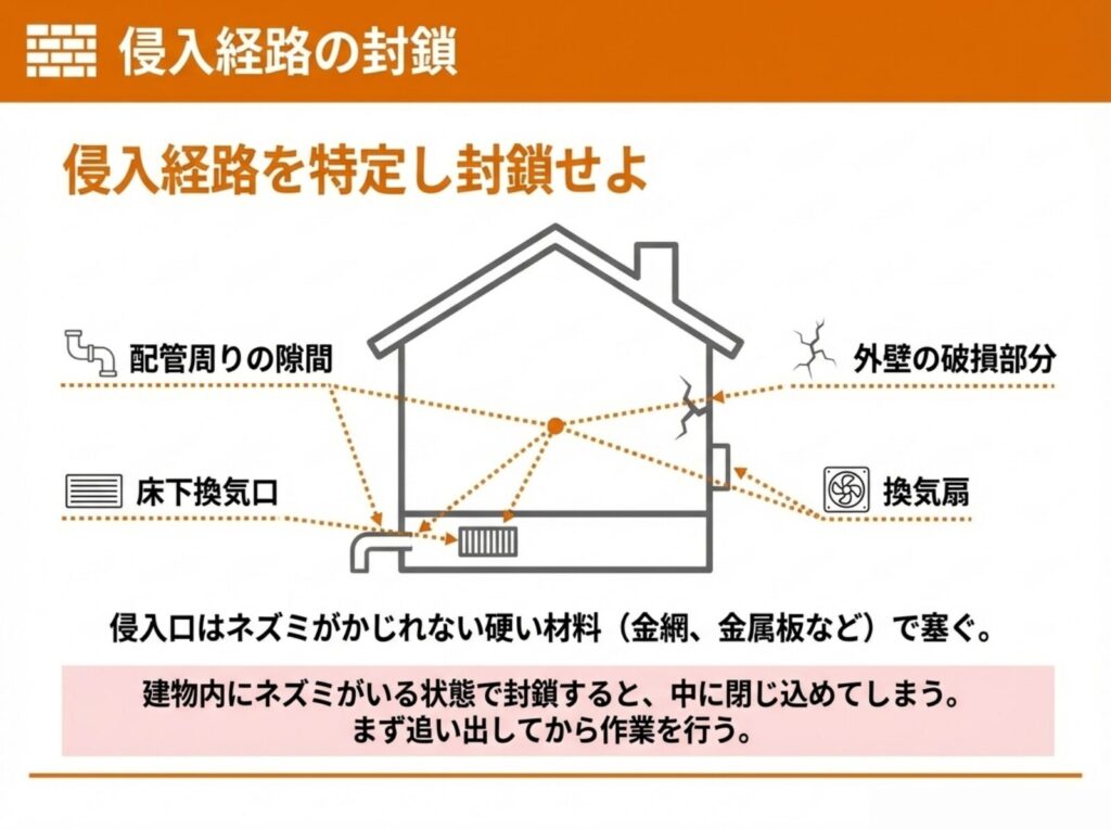 さらに大切なのは、エサの除去・巣材の片付け・侵入口の封鎖による環境整備でしょう。