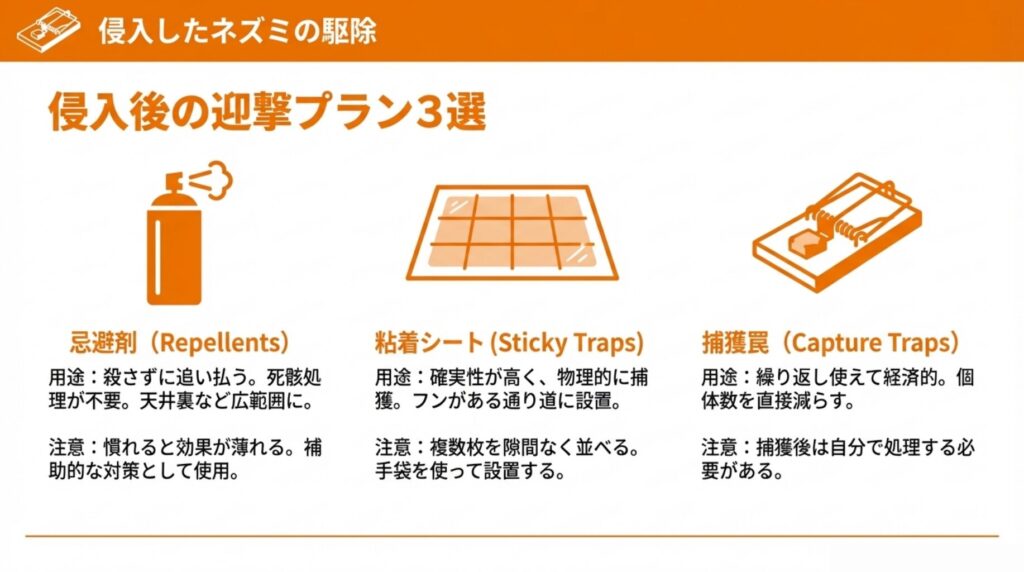 すでに侵入したネズミには忌避剤や粘着シート、捕獲罠などを状況に応じて使い分けてください。