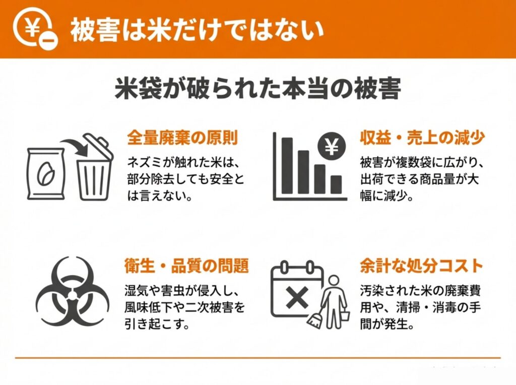 複数の米袋が被害を受けると、出荷できる商品量が大幅に減って売上が落ちます。