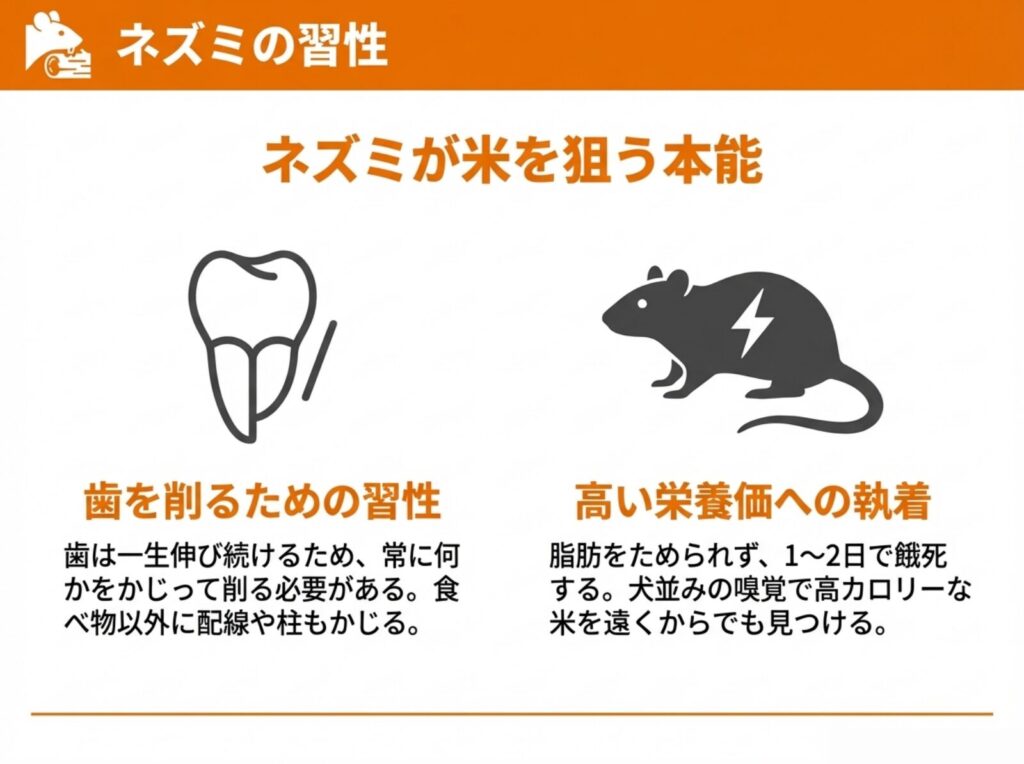 ネズミによる被害は、お米の品質低下や衛生問題も引き起こします。