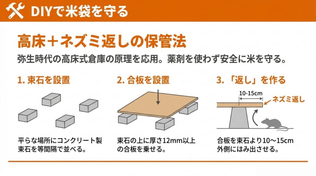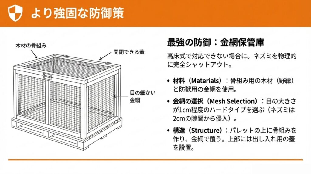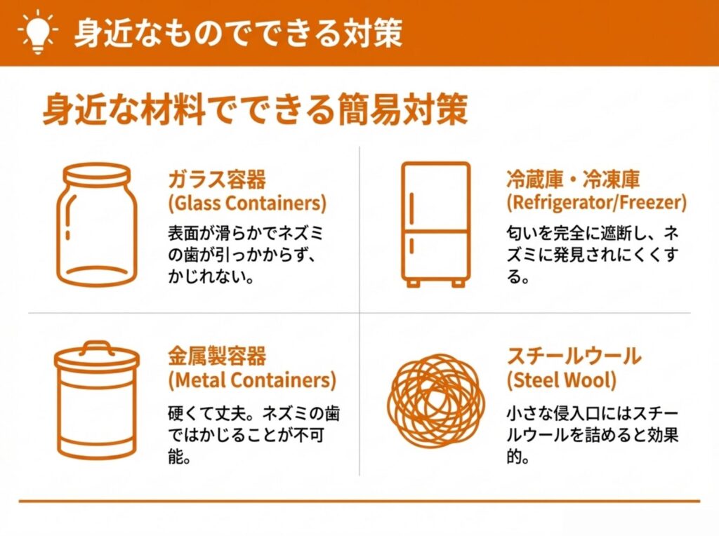 効果的な対策としては、高床式保管庫や金網による物理的な防護、ガラス容器や冷蔵庫を使った密閉保管があります。