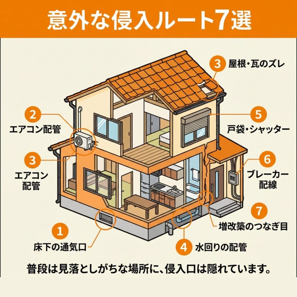床下の通気口や配管まわり、エアコンの穴、屋根の隙間など、さまざまな場所が侵入経路になりえます。