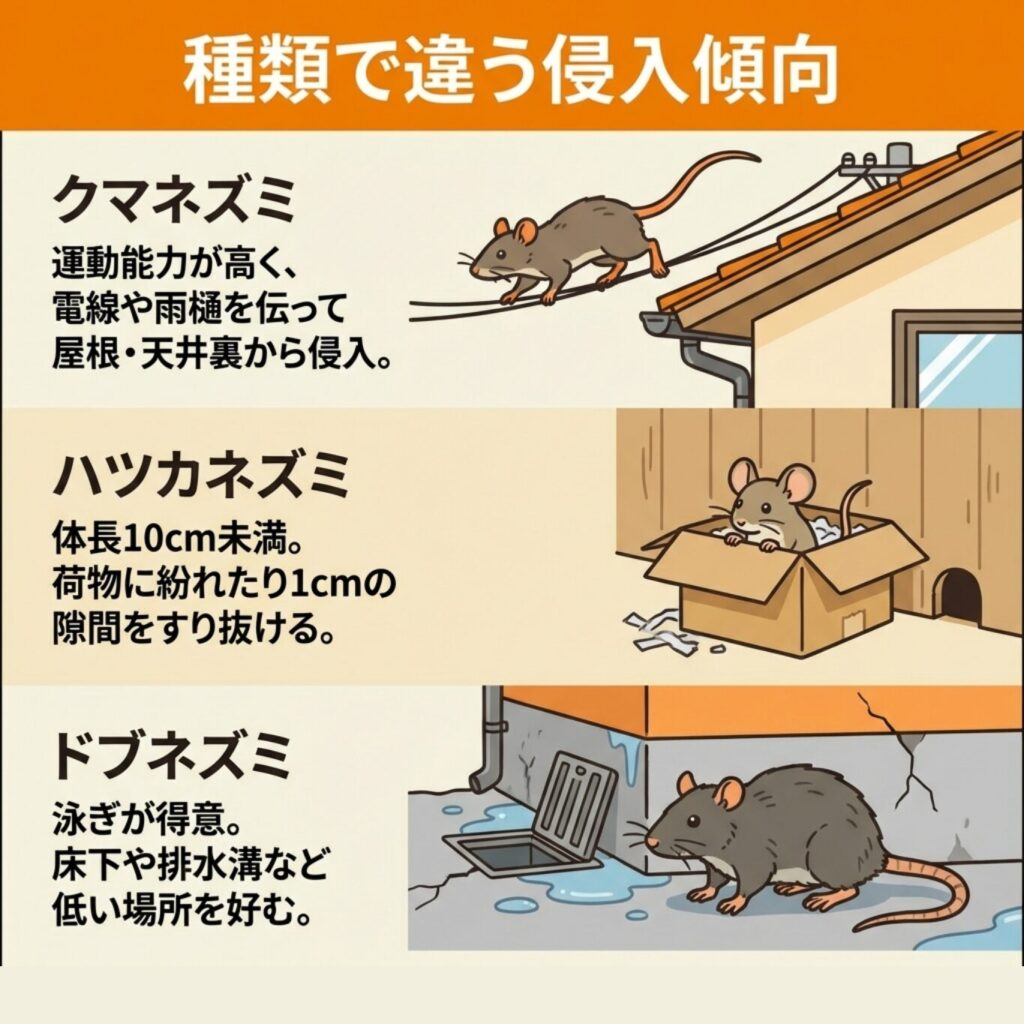 それぞれ体の大きさや好む環境が異なるため、侵入しやすい場所にも違いがあります。