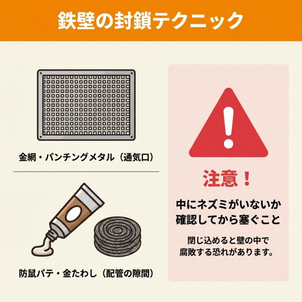 侵入口が見つかったら、金網やパテでしっかり塞ぎ、エサや巣材になるものを片付けて再発を防ぎましょう。