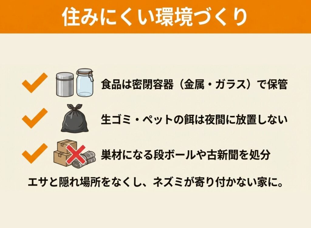 再発を防ぐには、駆除だけでなく侵入防止と環境整備が欠かせません。